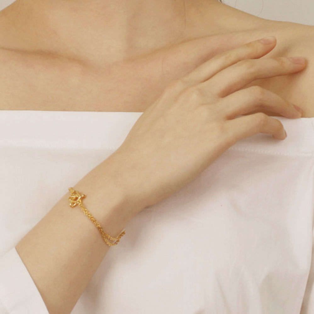 두돈의 무게로서 적당한 크기의 이 팔찌는 섬세한 별 모양 디자인으로 눈길을 사로잡습니다. 빛나는 순금의 고유한 광택과 섬세한 디테일이 고급스러움을 더해줍니다. 이 특별한 액세서리는 클래식하면서도 독특한 디자인으로 다양한 스타일과 잘 어울리며, 데일리한 룩에도 완벽하게 어울립니다.